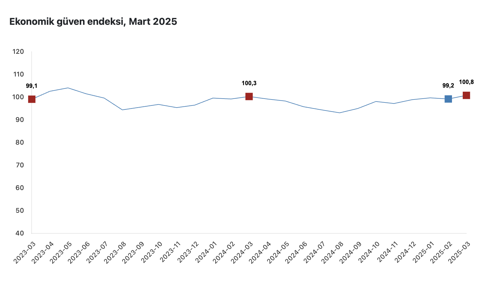 TÜİK verilerine göre Ekonomik Güven Endeksi, Mart 2025’te 100,5 seviyesine yükselerek iyimser beklentileri güçlendirdi. Ancak sektörel bazda farklılıklar dikkat çekiyor. İşte detaylar…